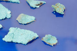 Las pequeñas formaciones que presentamos en este proyecto están inspiradas en estos procesos sedimentarios; fragmentos de cobre que resultan de una reacción redox, reducción-oxidación, entre sulfato de cobre (un compuesto químico derivado del cobre que forma cristales azules solubles en agua y metanol) y aluminio (un metal no ferromagnético considerado como el tercer elemento más común encontrado en la corteza terrestre): "la entropía de la técnica deja a uno con un límite vacío, o sin límite alguno", en palabras de Robert Smithson.